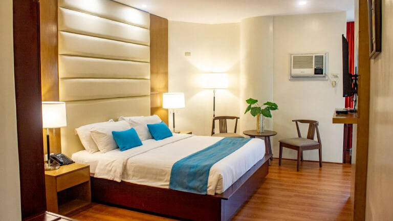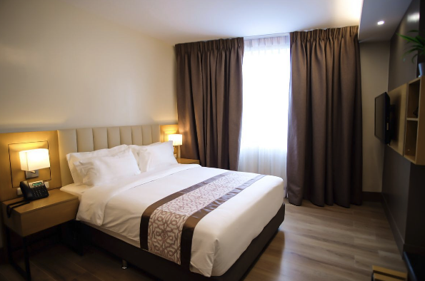 このホテルの特徴はスタッフのホスピタリティの高さと、日本人にとって使いやすい「トイレとシャワーが完全に独立した」設計にあります。学校までは毎朝夕の無料送迎サービスを利用して快適に移動できるほか、徒歩1分圏内にショッピングモールやクリーニング店があり、日用品の買い出しにも困りません。最上階にはルーフタップレストランがあり、夕食やリラックスタイムを楽しむ留学生に人気のスポットとなっています。